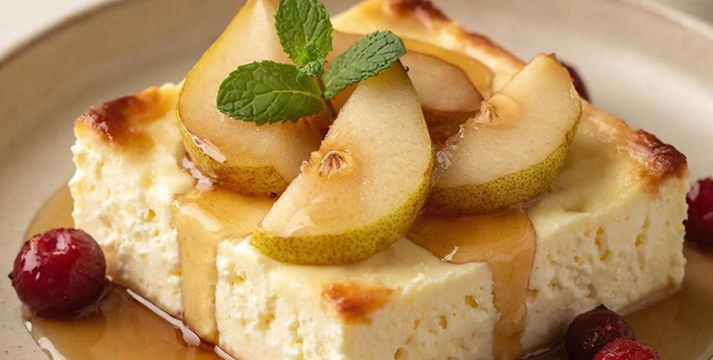 Творог протрите через сито или пробейте блендером. Смешайте с яйцом, медом и манкой, дайте постоять 15 минут. Груши нарежьте дольками. Форму смажьте маслом, выложите половину творожной массы, сверху груши, затем оставшийся творог. Запекайте при 180°C 35–40 минут до золотистой корочки. Подавайте со сметаной или ягодным соусом.